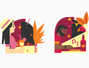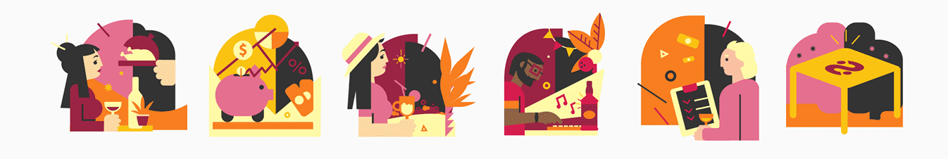 A paleta escolhida para a marca traz cores quentes para combinar com os momentos de descontração e alegria nos quais esperamos estar presentes. Além disso, trazemos cores de bebidas que fazem parte dessas confraternizações: o amarelo para a cerveja e o vinho para a bebida homônima.