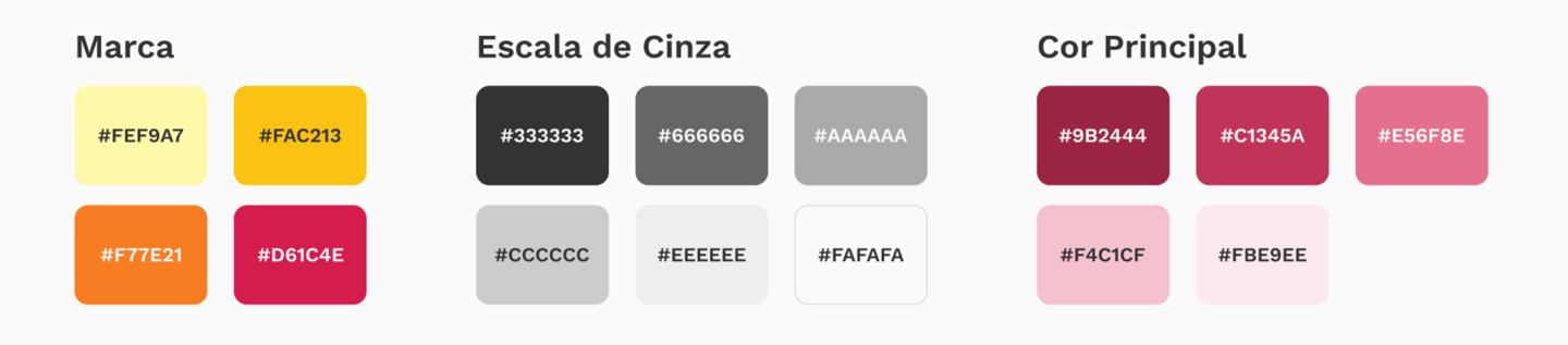 Para o aplicativo, trabalhamos com uma escala de cinza que fique confortável para os olhos das pessoas usuárias. Essa escala serviu como base, também, para a cor principal do aplicativo, o vinho. A partir da cor da marca, desdobramos em uma paleta de tons avermelhados versátil e que garante o contraste necessário para a leitura das informações.