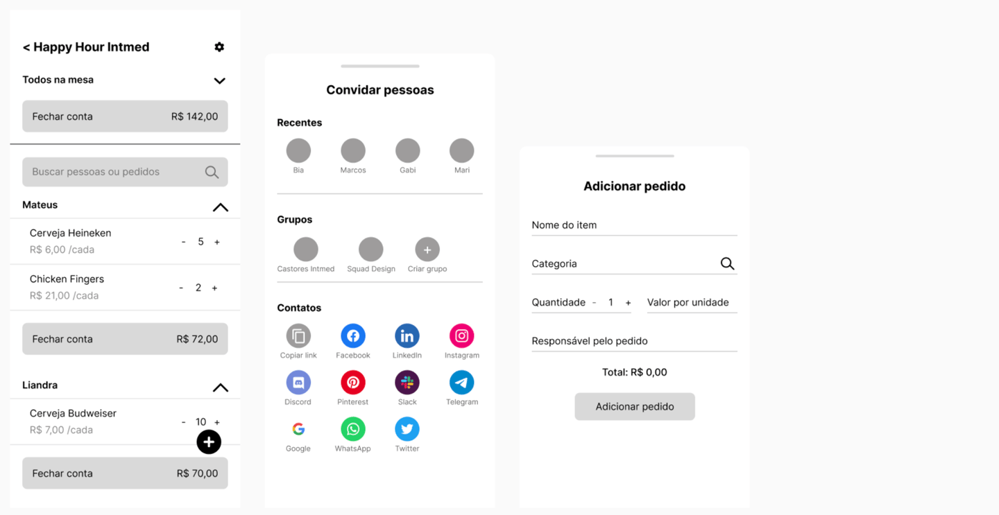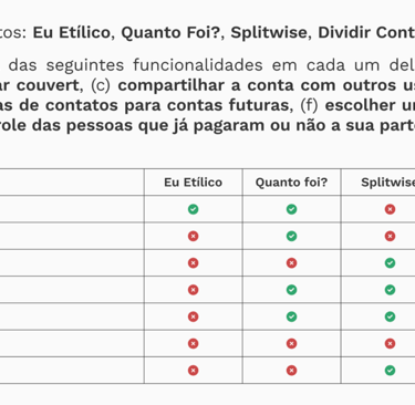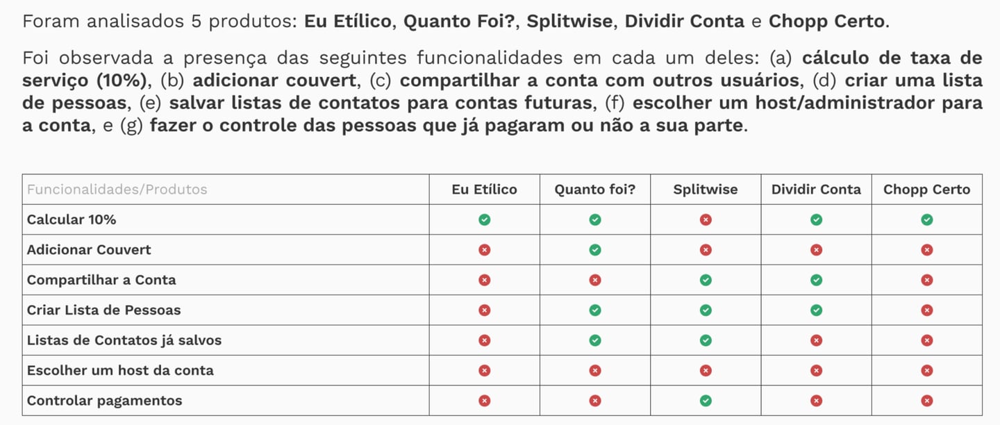 Ao mesmo tempo, realizamos um benchmarking com os principais aplicativos do mercado: Splitwise, Eu Etílico, Quanto foi?, Dividir conta e Chopp Certo. Analisamos usabilidade, funcionalidades e linguagem. Descobrimos que, apesar de eficientes, muitos desses apps careciam de empatia no design — eram muito técnicos, com pouca personalização e linguagem neutra ou fria. Essa análise reforçou nosso diferencial: entregar funcionalidade com afeto.