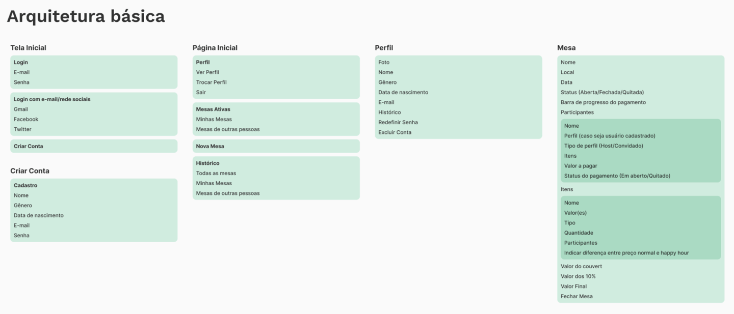 Com as dores e desejos dos usuários bem mapeados, chegou o momento de transformar empatia em estrutura. Antes de qualquer interface, precisávamos garantir que o app fizesse sentido na forma como se organiza e se conecta internamente — por isso, começamos pela arquitetura da informação.
