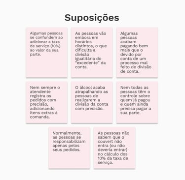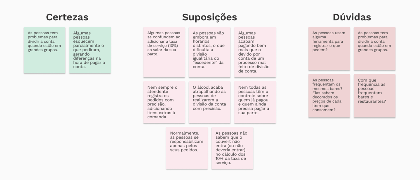 Começamos com a Matriz CSD (Certezas, Suposições e Dúvidas), uma ferramenta que nos ajudou a organizar o que achávamos que sabíamos sobre o problema. Por exemplo, tínhamos como certeza que dividir contas gerava desconforto entre amigos, mas tínhamos dúvidas sobre como as pessoas escolhiam as ferramentas para resolver isso. Esse exercício abriu caminhos para investigar com mais foco e intenção.