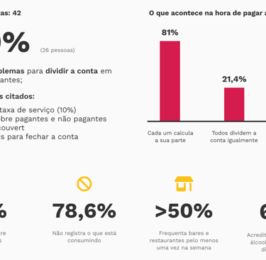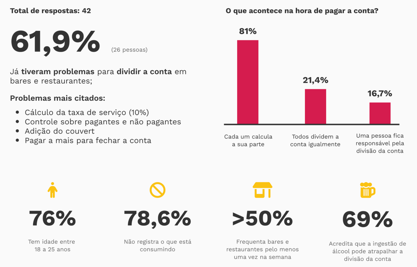 Com a CSD mapeada, partimos para uma pesquisa quantitativa, distribuída online, que coletou mais de 40 respostas. O objetivo era entender comportamentos, hábitos e dificuldades das pessoas na hora de dividir gastos.