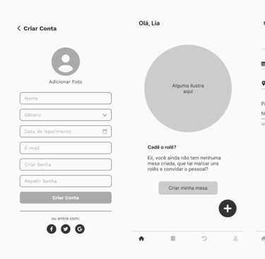 Com isso em mãos, desenhamos os primeiros wireframes de baixa fidelidade, testando os principais caminhos antes de qualquer preocupação estética. O foco era um só: funcionalidade com fluidez.